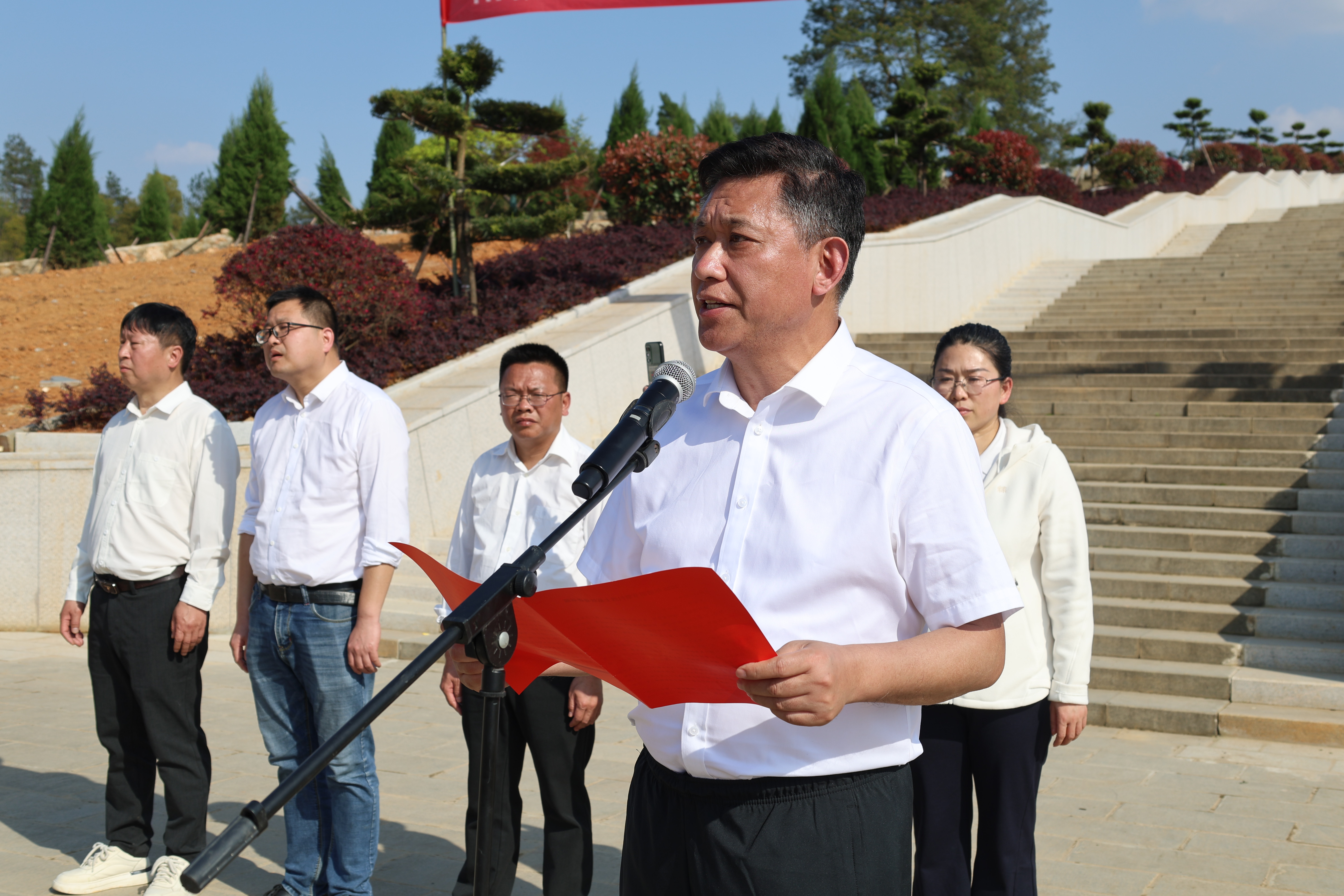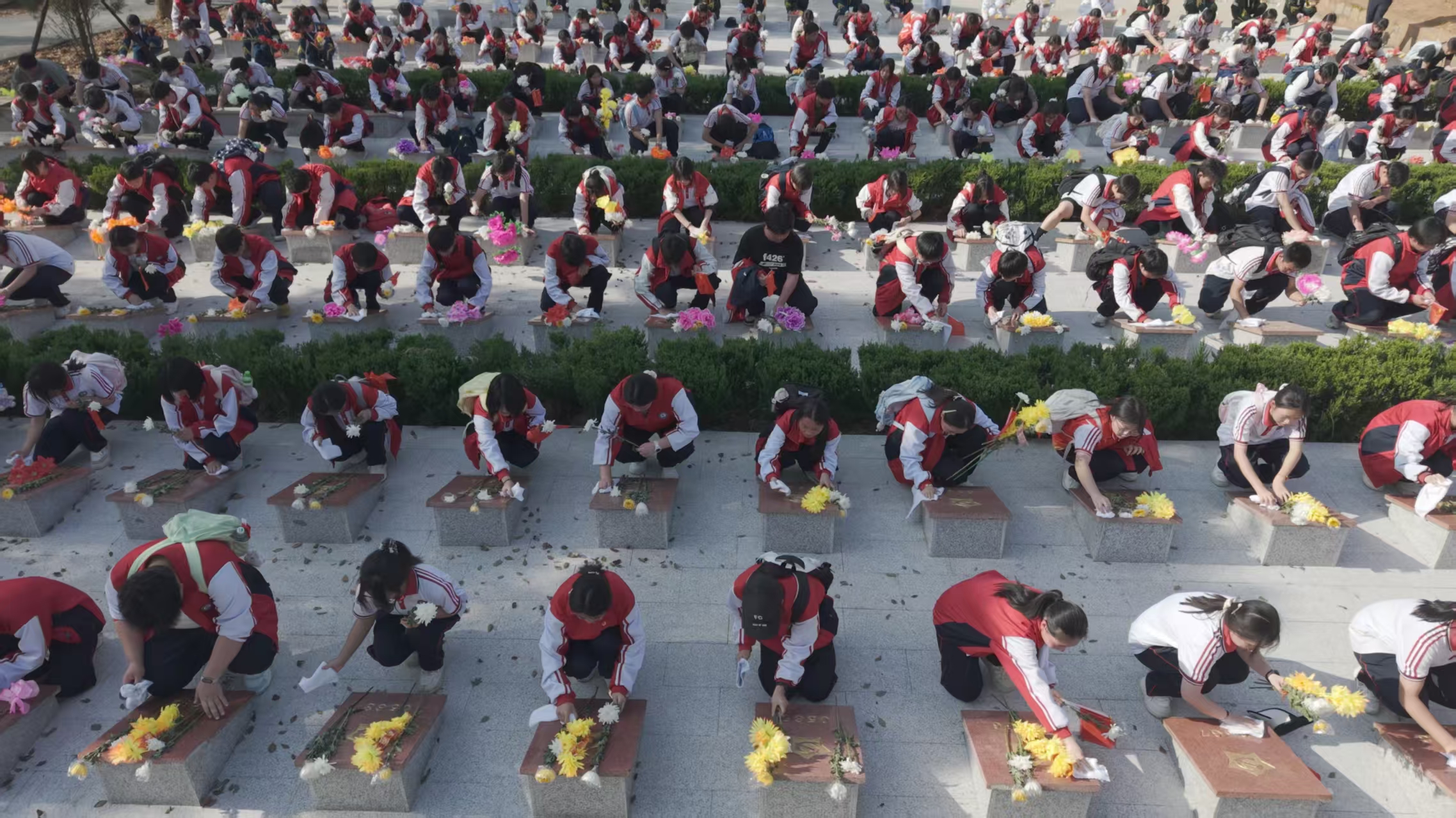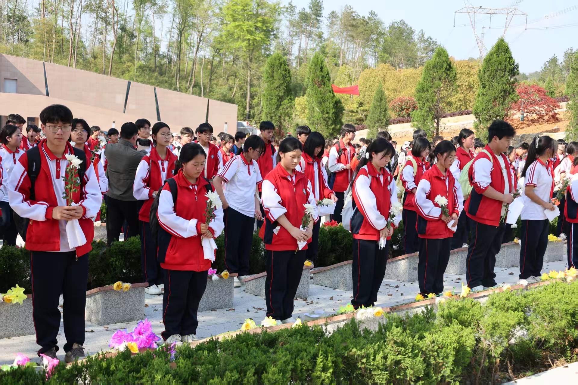 下午3时许,队伍抵达终点——湘鄂赣边区鄂东南龙港红军烈士陵园,全体师生举行庄严肃穆的祭扫仪式。在烈士纪念碑前,师生敬献花篮、聆听革命老战士讲述峥嵘岁月、庄严宣誓,并为革命烈士画像。在庄严肃穆的氛围中,全体师生向3011名红军烈士墓碑深深鞠躬、献上鲜花,轻轻拂去墓碑上的尘土,静思默哀,深切缅怀革命先烈。